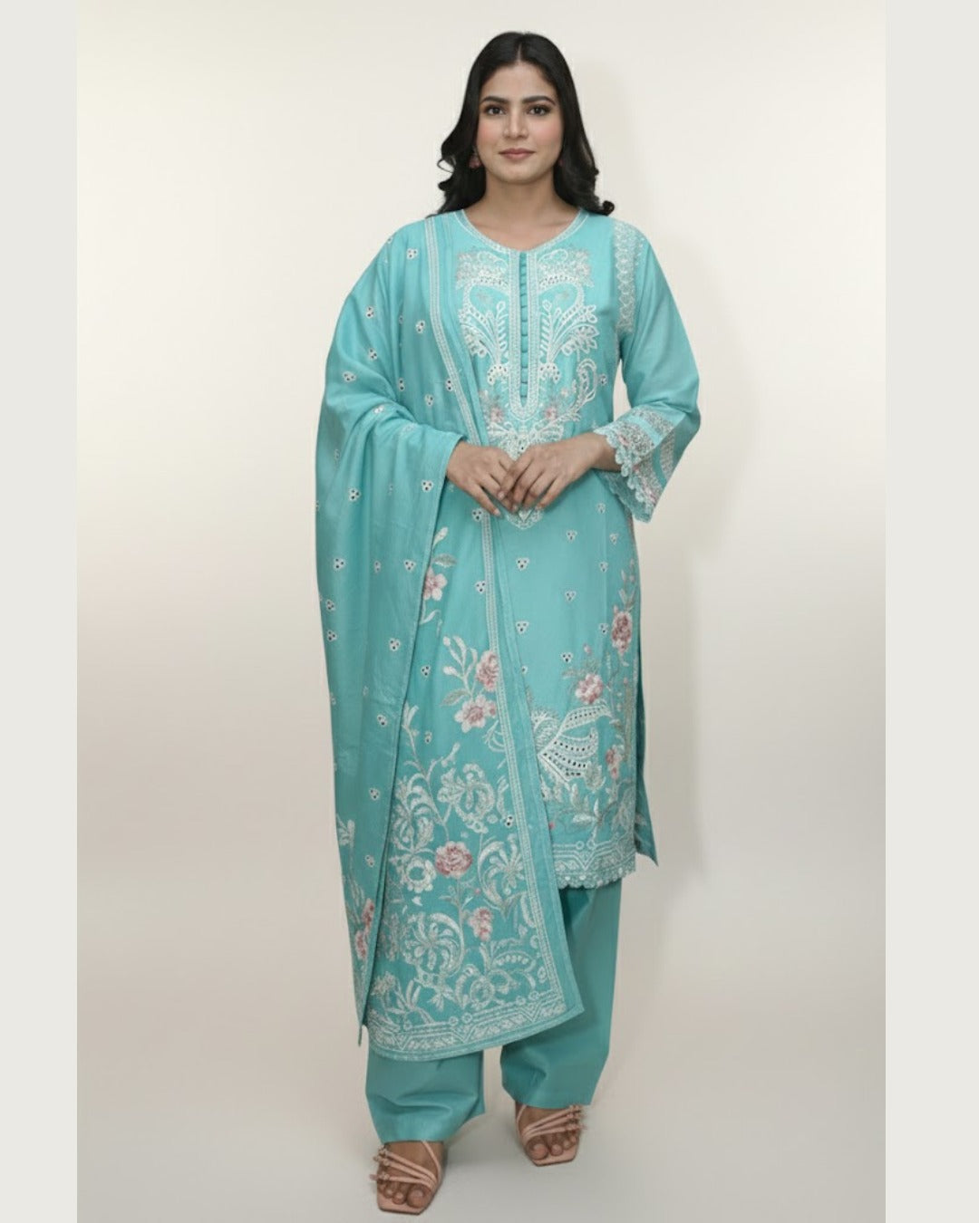 Shirt Fabric : Cotton  Trouser Fabric : Cotton  Season : Summer Outfit Type: Eastern   Description: Embroidered 3-Piece Suite showcases delicate embroidery...