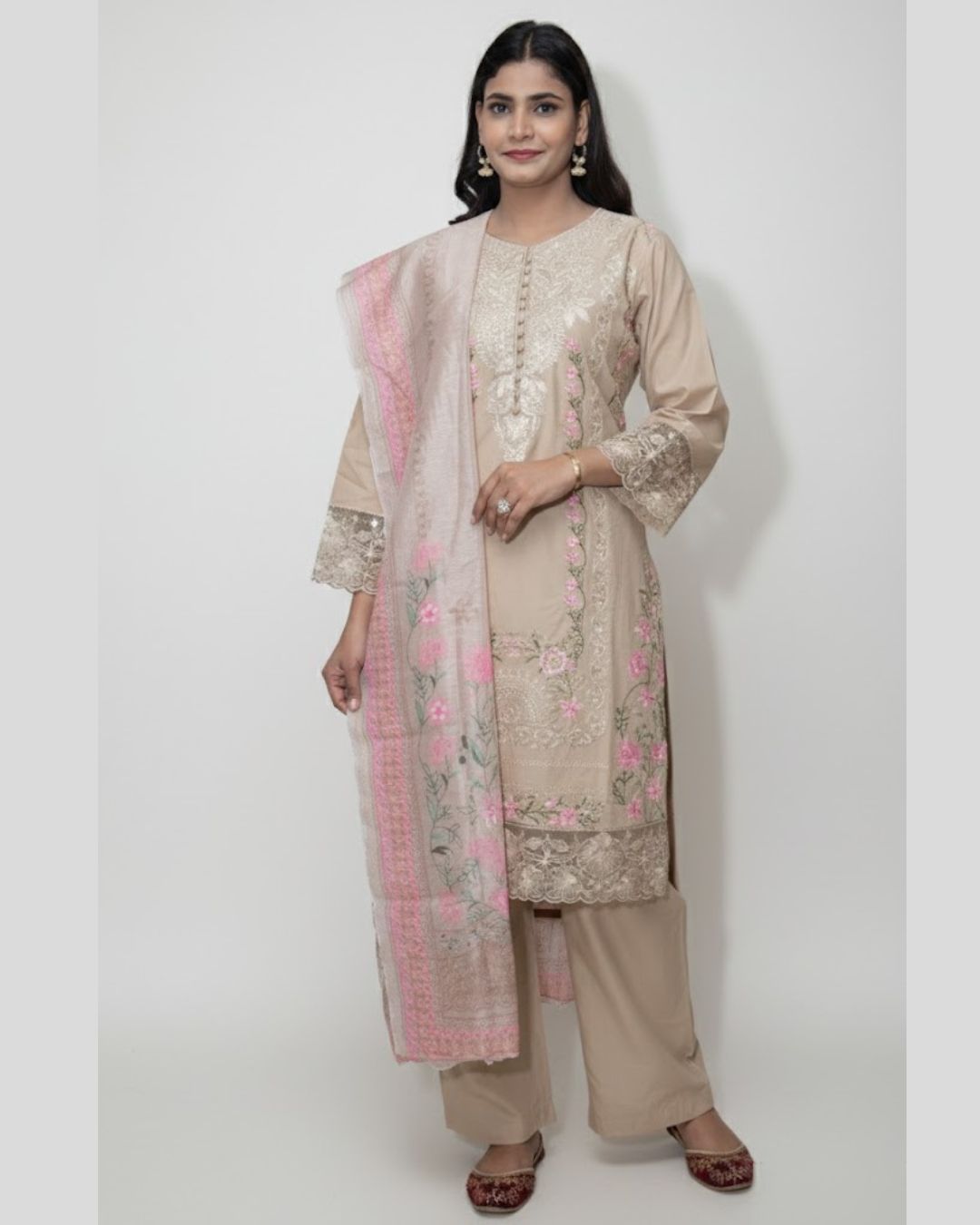 Shirt Fabric : Cotton  Trouser Fabric : Cotton  Season : Summer Outfit Type: Eastern   Description: Embroidered 3-Piece Suite showcases delicate embroidery...